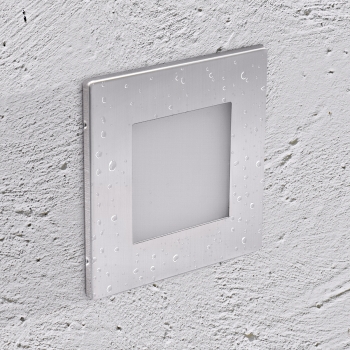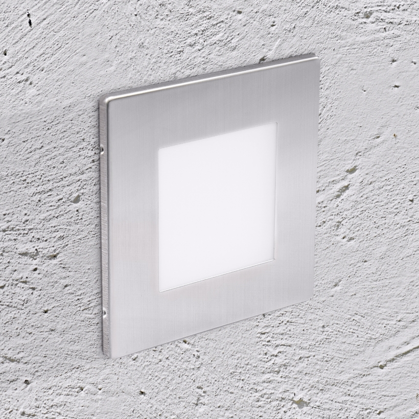 Energiesparender LED-Wandeinbaustrahler mit rostfreier Edelstahl-Frontplatte und Milchglas-Diffusor der für ein blendfreies Licht sorgt. Diese Beleuchtung ermöglicht das setzen stilvoller Lichtakzente.