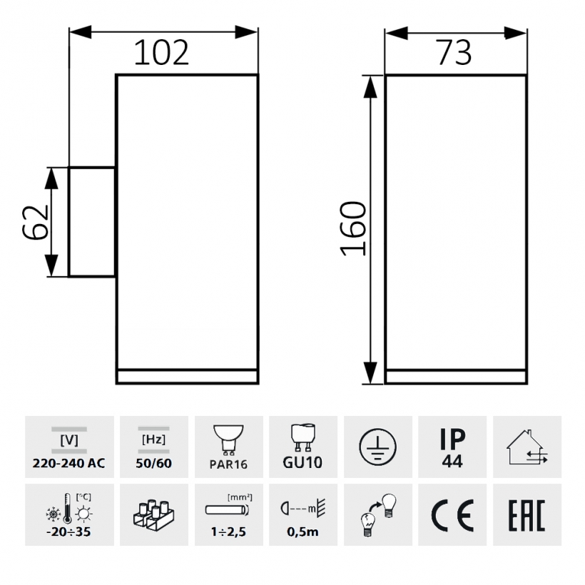 | Maße außen ca.: | Länge: 160mm, Breite: 73mm, Tiefe (mit Wandsockel) 102mm: | ||
